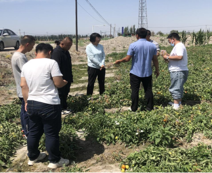 服务团队到田间示范基地中仔细查看了小麦和西红柿的长势,强调农业生产要科学合理,抓住关键时节,确保粮食生产安全,全面完成粮食生产既定任务。(文/郝斌 摄/黎双)