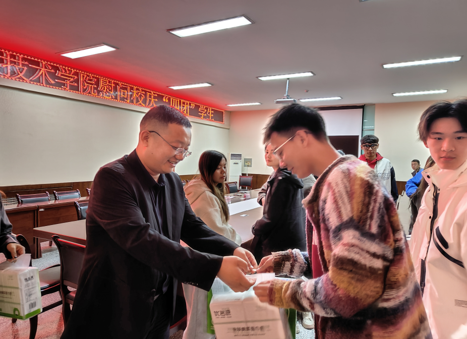 魏晓柳副书记代表学院肯定了“四团”同学刻苦练习、不畏困苦的工作热情,对“四团”同学为校庆工作及学校精神文明建设所作出的积极贡献表示衷心感谢和亲切慰问,并为“四团”同学发放慰问大礼包。