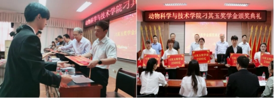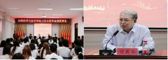 颁奖典礼在庄严而热烈的氛围中拉开了帷幕。首先,刁其玉老师发表了热情洋溢的致辞,对获奖学子表示热烈的祝贺和殷切的期望。随后,颁奖典礼进入高潮,在热烈的掌声中,获奖学子们依次走上领奖台,接受领导和刁老师颁发的荣誉证书和奖学金。最后,兽医2022级孟竹同学发表获奖感言。