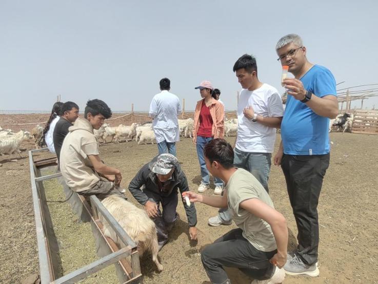 高进东和买买提·吐尼亚孜老师带队,动物医学专业大四学生艾力·图尔荪、阿力木·阿卜拉和大一学生卢情阳、张心愿、周鑫、邹乐乐、汪朝娟一行,到温宿县山羊养殖场进行科技服务。