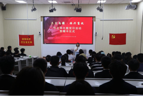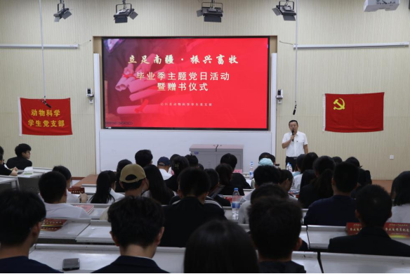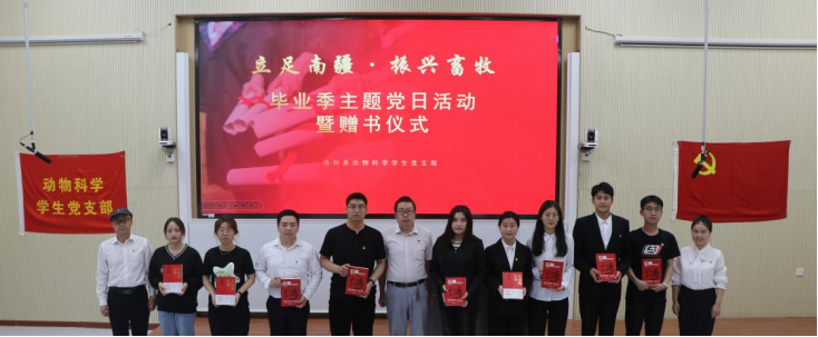 党旗引领铭初心,奋楫扬帆再出发。为深入学习把握习近平新时代中国特色社会主义思想,共同践行初心使命,延续共产党人精神血脉,厚植爱党爱国情怀,树立为人民服务的远大抱负,动科系党总支于6月6日在综合楼阶梯教室1开展毕业生党员欢送仪式。学院党委副书记魏晓柳、后勤保障中心党总支副书记邢金明、动科系党总支书记许贵善、党政办主任缪建梅、动科系学生党支部书记姚亚玲、研究生党支部书记芮雪、动科系学生党支部副书记王式琴,动科系教工党支部、学生党支部党员代表和积极分子代表参加此次活动。