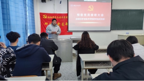 研究生党支部在综合楼101教室召开2023年下半年预备党员接收大会,会议以线上线下结合的方式召开,由啜力文同志主持,党支部书记芮雪同志和党支部副书记胡延波参加会议。