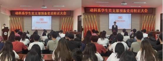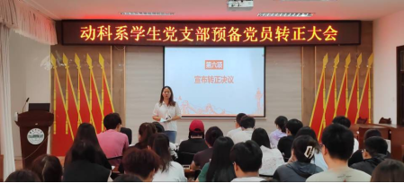 为进一步规范党员发展流程,保持党员队伍的先进性和纯洁性,为党组织注入新鲜活力,2024年5月13日,动科系学生党支部在动科楼318通过线上线下相结合的方式召开预备党员转正大会。支部书记姚亚玲、副书记王式琴和全体党员参加,会议由李祯同志主持。