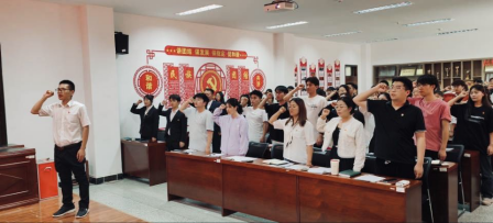 经支部大会无记名投票表决,姚亚玲宣读大会同意张轩等18名同志按期转为中共正式党员的决议。在孔兵南同志的带领下,全体党员面对党旗,重温入党誓词。