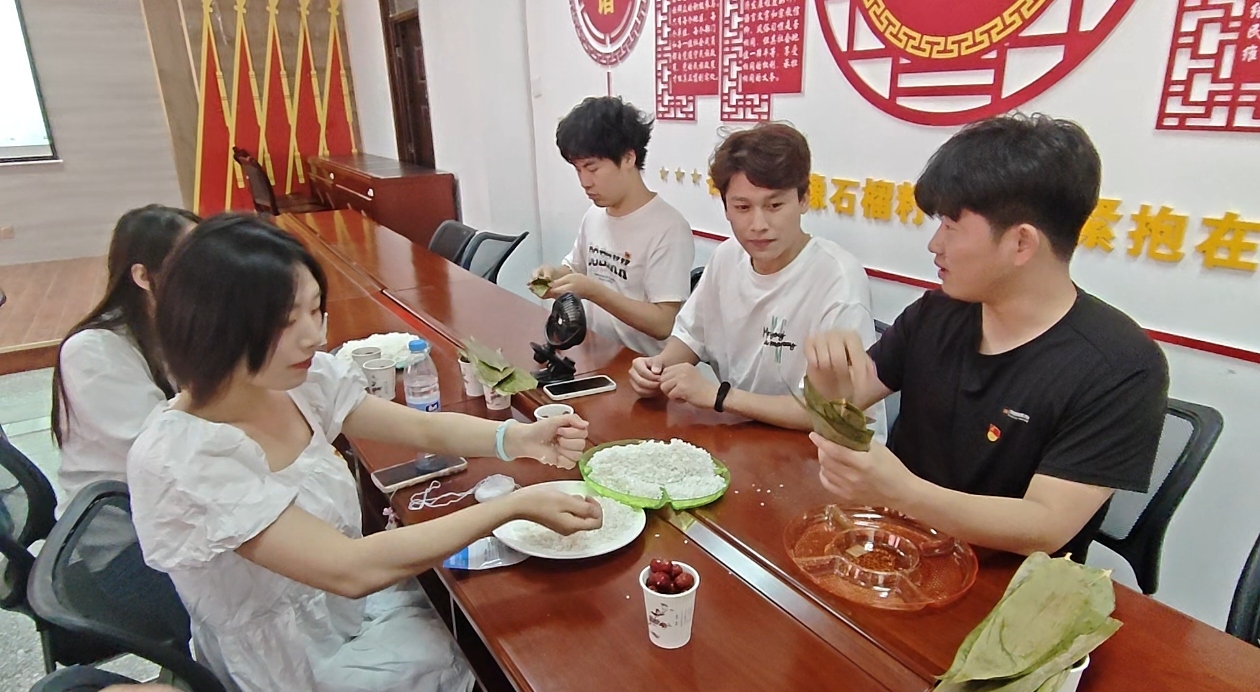同志们提前准备好粽叶、红枣和糯米,浸泡后整齐地摆放在桌上,大家纷纷拿出自己的看家本领,围在一起边学边包,捋粽叶、做“漏斗”、填糯米、压紧实、封口、扎捆,每一个步骤都显得那么认真。同志们互相交流包粽子的技巧,有的还亲自示范,传授自己的心得,现场气氛热烈而温馨。“能够在毕业离校前和大家一起包粽子、吃粽子,是一件非常开心且有意义的事情,这不仅弘扬了传统文化的魅力和浓浓的节日氛围,更增进了我们支部同志之间的感情,这是我过得最开心且又最有意义的端午节。”马闻璐说。