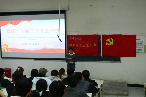 为深入学习贯彻党的二十届三中全会精神,引导学生党员充分认识到党的二十届三中全会的重大意义和深远影响,进一步加强学生党员的政治意识,筑牢理想信念,10月9日,动科系学生党支部在逸夫楼阶教8学习了“党的二十届三中全会公报”,支部全体党员和入党积极分子参加学习。