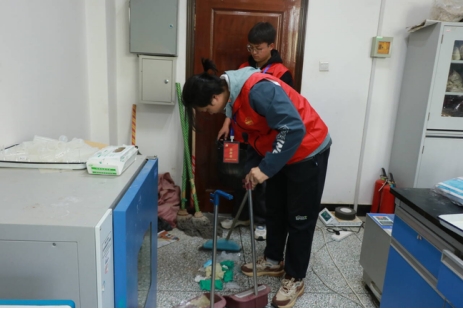 在支部委员的统一安排下,大家一早来到了实验室,按照前期分组分工,有的擦拭实验台,有的清扫地面,有的整理实验器材,同志们不怕脏、不怕累,以实际行动践行中国共产党的宗旨。