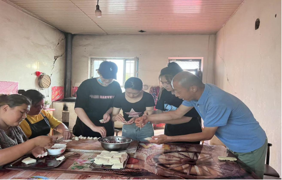民族的团结不仅体现在文化知识上,更体现在生活的方方面面,忙完了一天的宣讲民族团结活动和趣味运动会以后,村支书和村民们依旧是热情不减,邀请同学们留在家里吃饭。应他们热情的邀请,同学们和老师同当地居民一起做晚饭,大家都积极加入进来,老师也是忙活了起来,大家都夸张说老师不仅仅会教书育人,在生活方面也是给同学们树立了榜样。王老师和村支书在一旁准备饺子馅,村民们在桌子边擀面皮,这两边准备就绪后,大家就开始忙活起来了,同学们虽说都不太熟练,但大家都在努力跟着村民学习,包出来的饺子也是各种各样,这个过程是有苦有累,而当大家吃到饺子时,脸上也是洋溢着开心的笑容,认为一切的付出都是值得的。